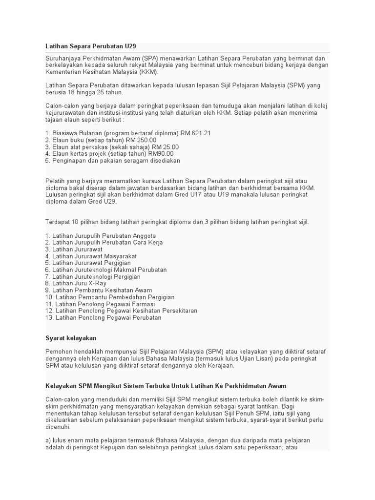 Anda tidak boleh berhenti kerja ataupun bekerja di sektor swasta selagi anda terikat dengan. Cara mengemukakan permohonan latihan separa perubatan spa 2021 lepasan spm diploma berumur antara 17 25 tahun. Jurupulih perubatan anggota 7.